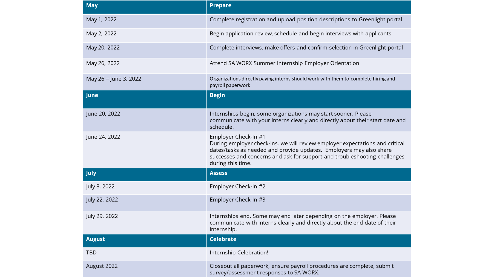 Whether hosting interns in-person or virtually this year, SA WORX wants your organization and your interns to have a fulfilling experience. The checklist below will help ensure you and your interns have the best experience.